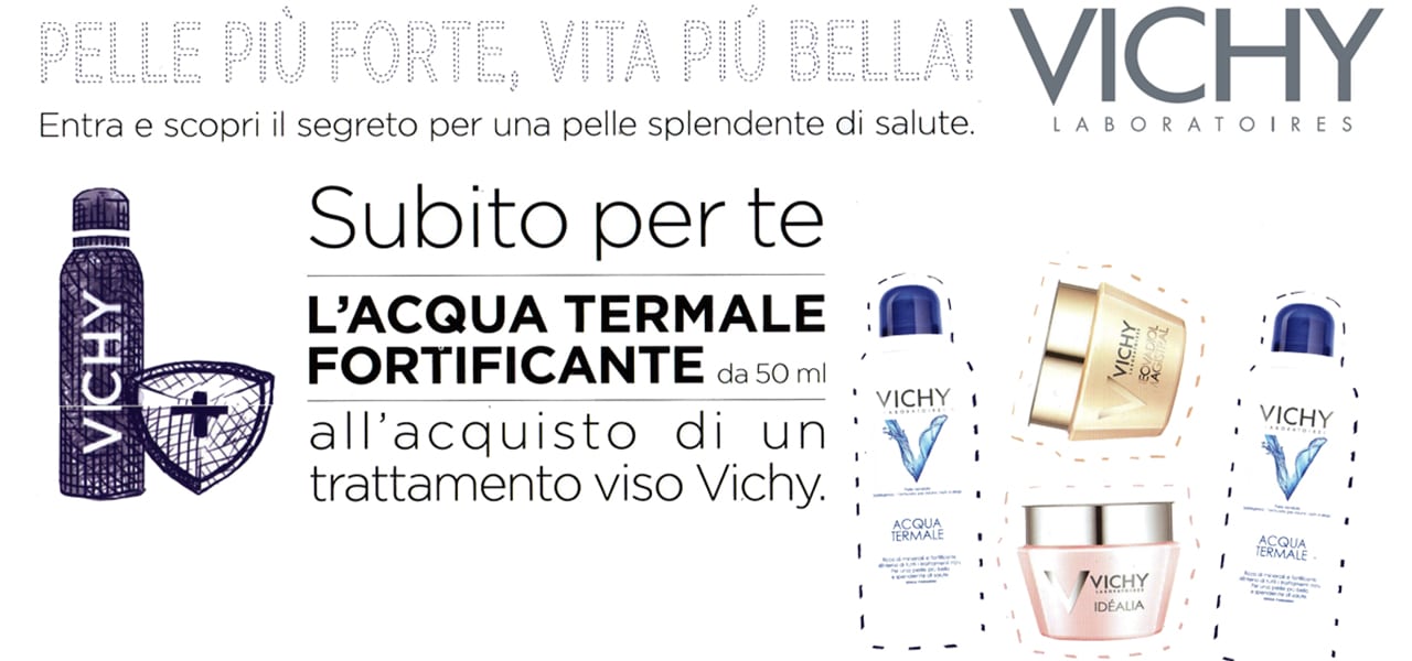 L’azienda ha un’unica missione: offrire a tutte le donne la possibilità di raggiungere la loro pelle ideale, che non è altro che il meglio al quale la loro pelle può aspirare. Per riuscire in una simile sfida Vichy parte innanzitutto dall’ingrediente da cui tutto è cominciato: l’acqua termale di Vichy, vera e propria acqua di bellezza. Quest’acqua, i cui effetti benefici sono scientificamente dimostrati da 26 studi clinici strumentali, è ricca di 15 minerali benefici e possiede proprietà lenitive, fortificanti e rigeneranti per la pelle. In occasione della giornata promozionale potrai ricevere un trattamento viso gratuito: un’esperta viso sarà a tua completa disposizione per una consulenza personalizzata e l’applicazione dei prodotti Vichy più adatti alle esigenze della tua pelle. Prenota subito!