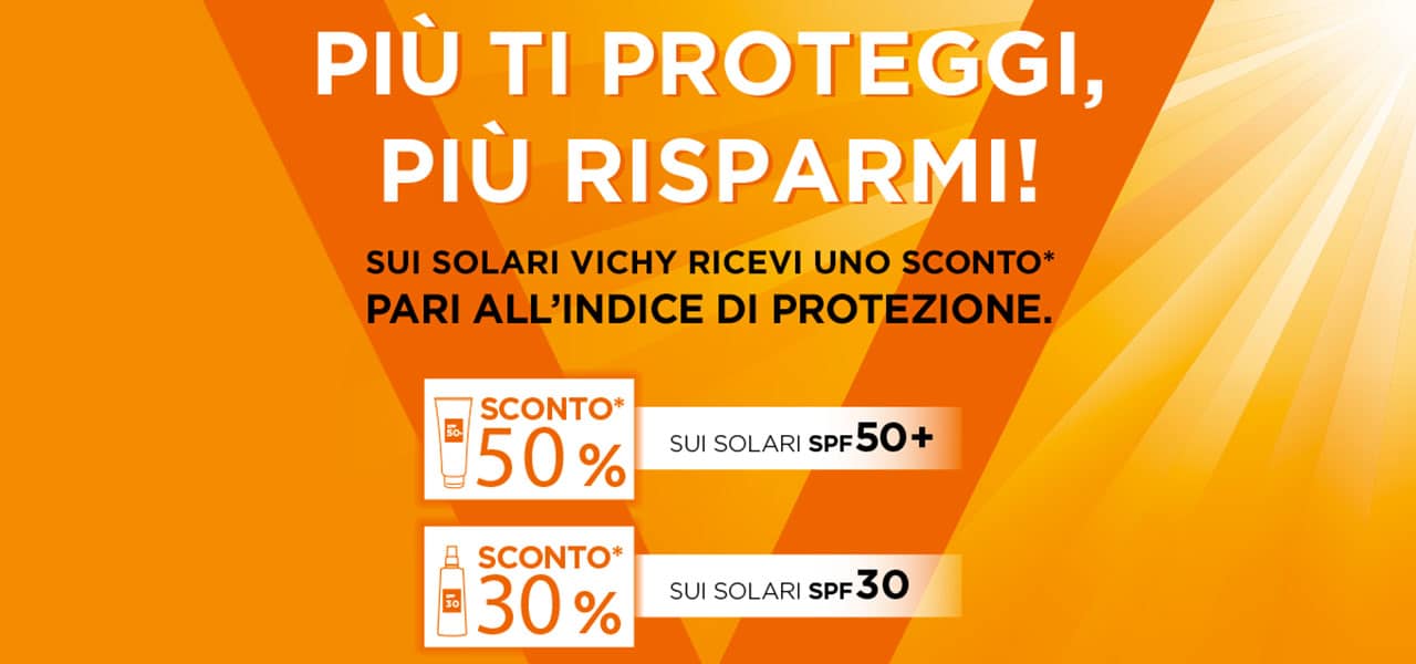 Per tutta l’estate proteggi la tua pelle con Vichy. E risparmia fino a 30€ sull’acquisto dei prodotti della linea Ideal Soleil. Chiedi consiglio ai nostri professionisti e fatti suggerire il prodotto a te più adatto. Con Vichy, la tua pelle è al sicuro.